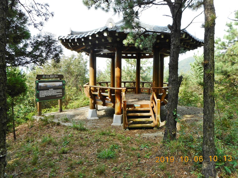 7분여 더 오르니 이정목과 함께 좌 팔각정 갈림길이 있는 삼거리로 올라서는데, '해넘이 명소'라는 팔각정은