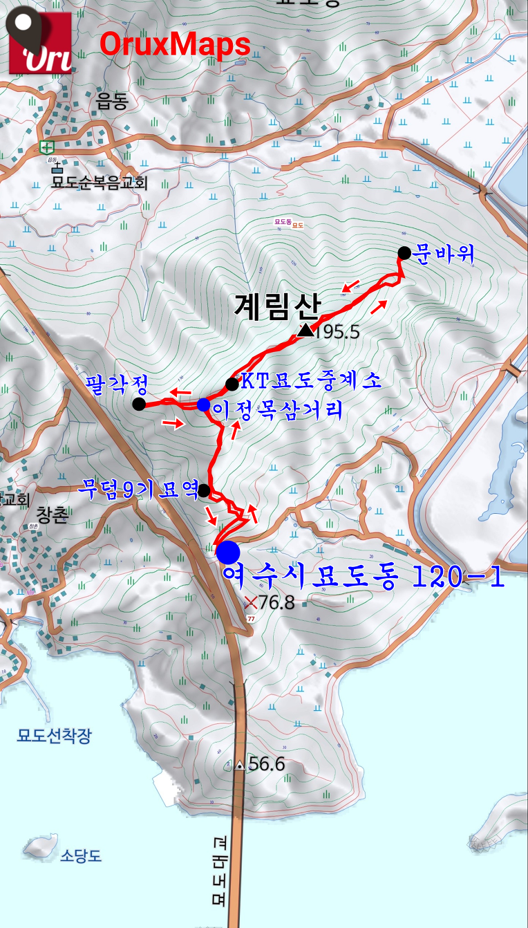 ㅇ.산행코스: '여수시 묘도동 1209의1' 매립공터-팔각정 갈림길 이정목 삼거리-계림산(남산) 정상-문바위 왕복-