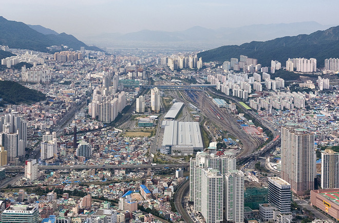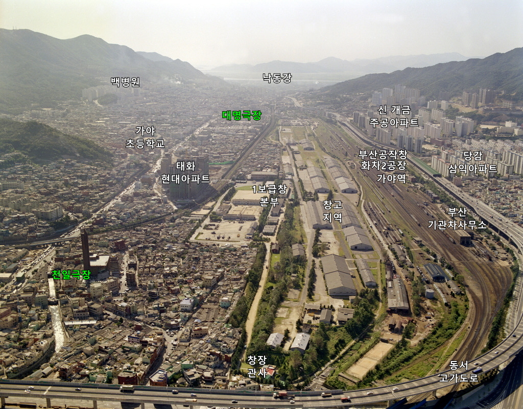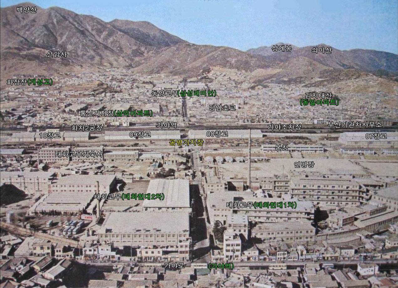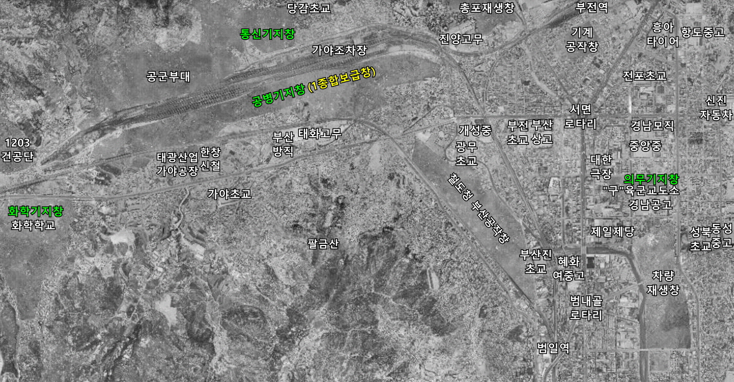 가야동 공병기지창 자리. 미군 공병대 주둔 1950년대, 뒤편에 가야조차장과 백양산 기슭의 당감동 지역이 보입니다.