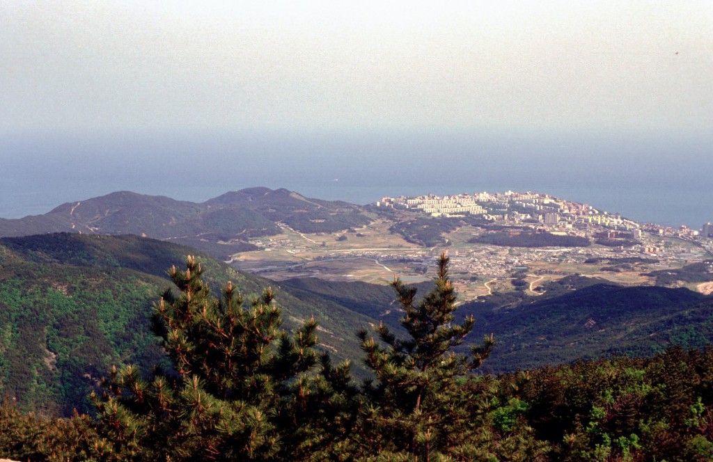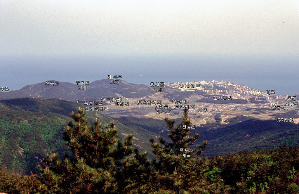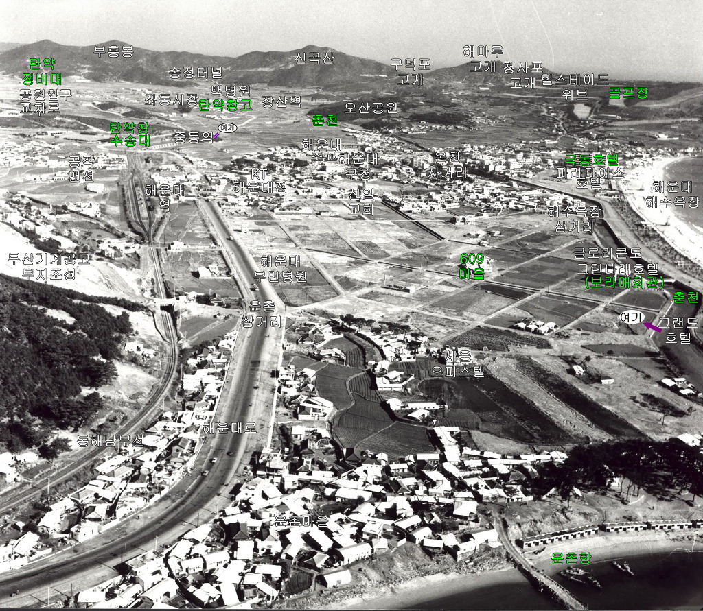 그리고 동해남부선도 보이고 오산(오산 앞에는 삼성 이병철의 별장도 있었고, 김지미의 집도 있었다고 합니다. 친구 중에 한 친구는 그때 지금 회장이 된 어린 삼성가의 사람들도 보았다고 합니다, 그때 잘했으면...ㅎㅎㅎ)도 분명히 보입니다. 또 와우산의 골프장도 보이고, 개발을 하려는지 산이 마구 깎아져 있습니다. 그리고 춘천본류 왼쪽과 오산 아래에 넓은 건물이 하나 보입니다. 바로 해운대초등학교(당시는 국민학교-일제식명)가 보입니다. 우리들의 어릴 적 추억이 간직된 곳입니다.