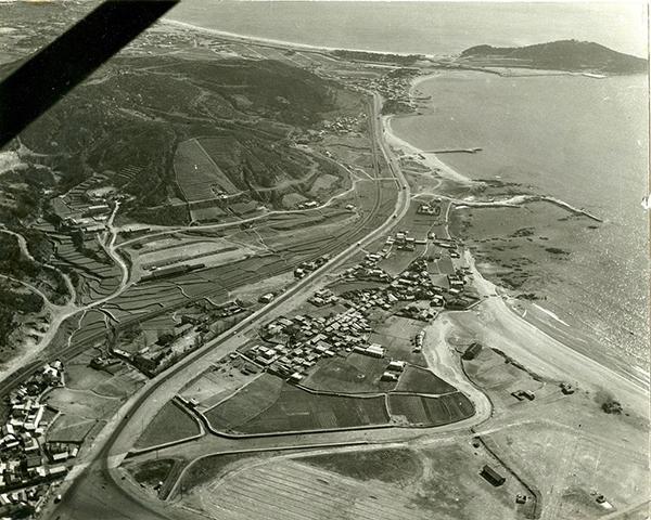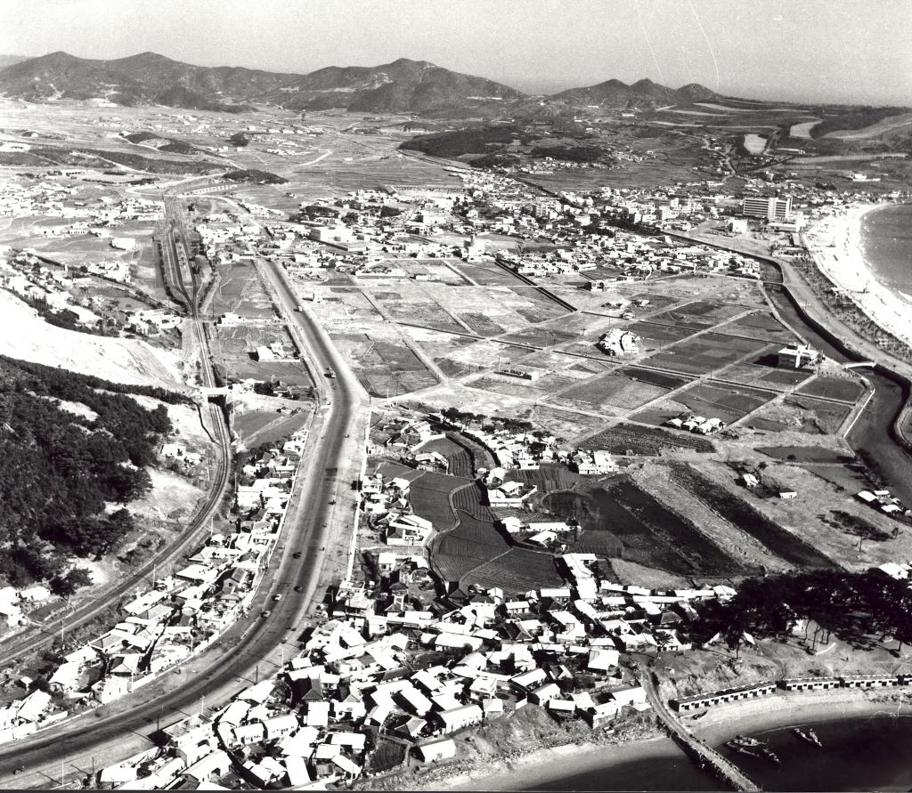 그 건물들 뒤로 농토와 못들이 보입니다. 지금의 좌동 신시가지지역입니다. 이 지역은 신시가지가 들어서기 전에 논과 미나리밭 그리고 탄약 창이었던 곳입니다. 우리의 친구들이 많이 살았던 지역입니다. 아직은 동해남부선(1935년 개통)과 해운대초등학교(1937년 개교)가 생기기전입니다.