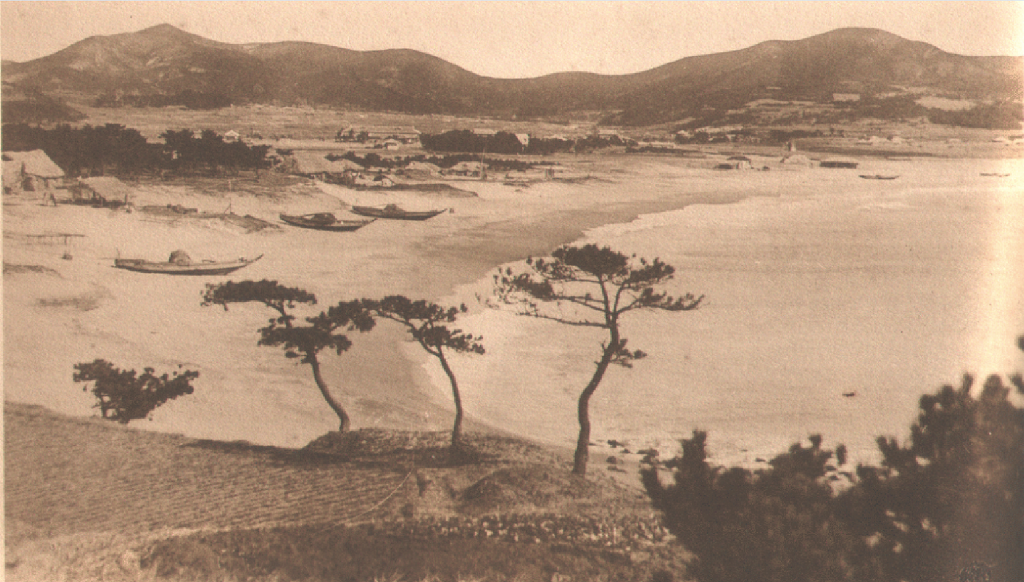 세 그루의 소나무 밑(앞의 소나무는 지금의 조선비취호텔자리입니다.) 바로 앞에 바위들이 보이네요, 지금도 바위들이 있지요, 그리고 넓은 해수욕장이보이고, 큰 어선 두 척이 보입니다.(바로 뒤의 초가집과 비교하면 제법 큰 어선임을 알 수 있습니다. 사진은 사진사가 동백섬 꼭대기에서-지금의 최치원동상 있는 곳-찍은 것으로 판단됩니다. 소나무의 높이와 멀리 장산밑자락이 보인다는 것은 -당시의 사진기가 넓고 멀리 찍을 수 있다는 것입니다. 또 원근감이 잘 표현됩니다. 그러므로 실제로는 배와 초가집사이가 제법 거리가 있음을 알 수 있습니다. 그래서 백사장의 폭이 넓음을 알 수 있습니다.)