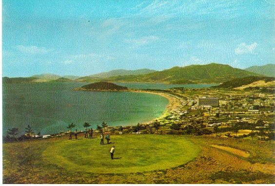 1960년대의 칼라사진입니다. 그 당시 대단히 귀했을 칼라사진입니다(아니면 흑백을 칼라로 입힌 것인 가요?). 지금의 와우산 달맞이 고개에 있는 골프장이네요, 이곳은 일제 때 일본인들이 경마장으로 사용한 곳 입니다. 그것은 박정희정부가 골프장으로 만들었고 박정희대통령이 해운대에 오면 극동호텔과 골프장 또 동백섬의 휴양지를 다녀갔다고 합니다. 1960년대 골프를 칠정도면 이들이 누구인지는 다들 짐작하실 것이다. 동백섬이 시원하게 보입니다. 조선비취호텔(1978년)이 들어서지 않았습니다.