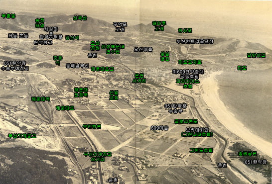아마 이사진은 해운대해수욕장에 파라솔이 보이는 것으로 봐서 여름에 촬영되었다고 보입니다. 그리고 골프장 바로 아래에 미군부대와 미군부대의 물탱크가 보입니다. 그리고 자세히 보시면 간비오산 옆에 개발을 하려고 땅을 파 해쳤습니다. 아마 한독기계공고(기계공고)를 지으려고 하는 것처럼 보입니다.