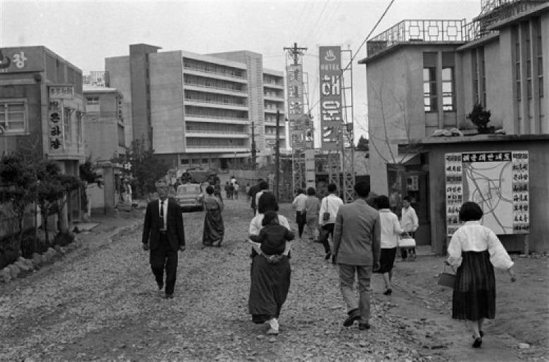 해운대각과 은하장 모습, 중앙에 극동호텔 건립중입니다.1964년 4월, 비포장 자갈길 이네요