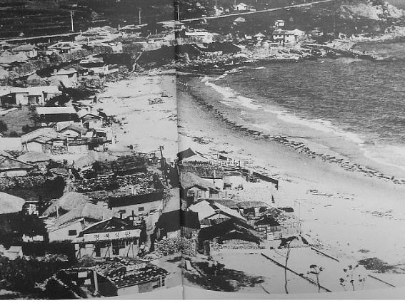사진에 보이는 경북식당자리는 지금 해운대리조트가 생기면서 없어졌지만 얼마 전까지 이곳은 미포의 회센터가 있는 곳이었다. 또한 해안도로가 만들어 지면서 해수욕장의 폭은 대폭 줄어들었고, 백사장의 끝 쪽이 큰 우물이 있었다. 그리고 위 고개로 올라가는 길이 보인다. 지금은 이 자리가 회센터 뒤로 횟집들이 들어섰고, 이곳의 우물터는 지금도 남아 있다. 얼마 전에 확인하기도 했다. 그리고 왼쪽 끝이 미포 방파제이고, 지금도 이 자리에 방파제가 있다. 뒤에 하얗게 보이는 기다란 길이 부산에서 포항까지 가는 동해남부선이다.