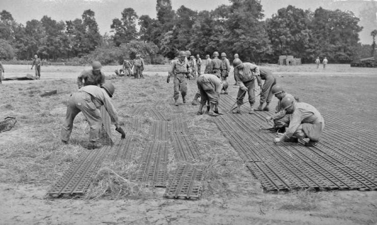 구멍이 뚫린 강화 철판을 깔개로 연결 작업을 하는 미군 공병대 병사들 - 1944년