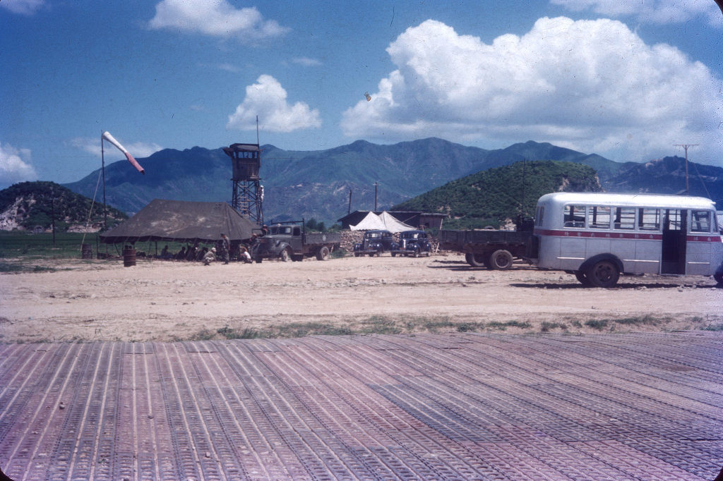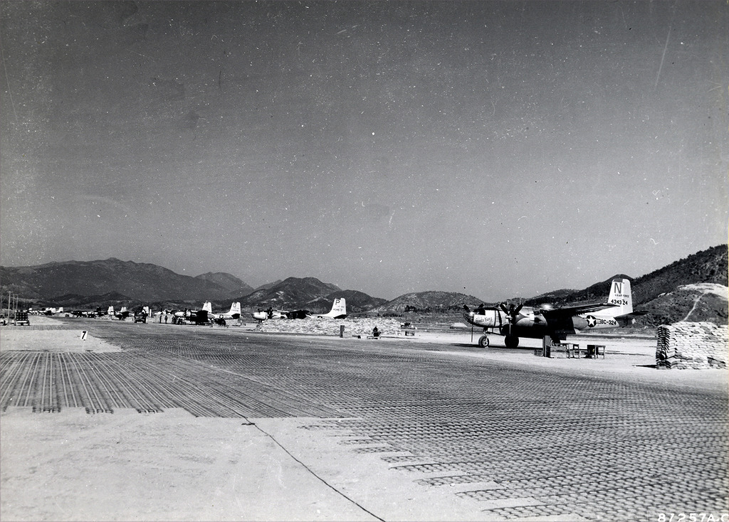 PSP가 깔린 K-1 김해비행장 모습, 뒤편에 보이는 산은 구포,사상 뒤산(백양산줄기)이다. 1950년8월