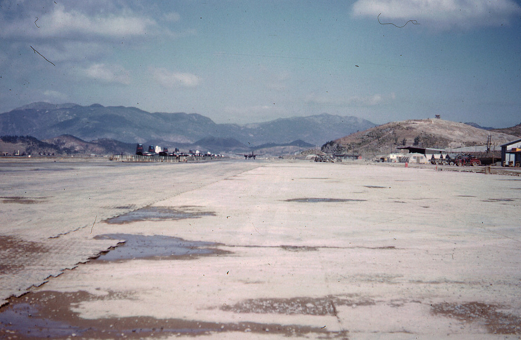 사진 왼편에 PSP가 깔린 수영비행장 활주로 모습이 보인다. 뒤편은 금정산자락이다. 1953.3.2