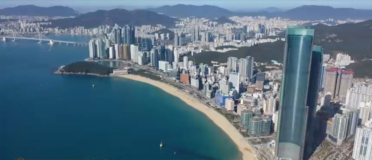 남북으로 길게 펼쳐진 해운대 백사장 한 가운데쯤에 서 있는