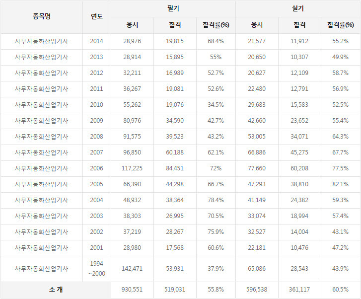 사무자동화산업기사 연도별 응시인원, 합격인원, 합격률 (2014년까지) 작성자무지개|작성시간15.03.14|조회수26 목록 댓글 0 글자크기 작게가 글자크기 크게가 출처 : 큐넷(q-net.or.kr) 다음검색 현재 게시글 추가 기능 열기 북마크 공유하기 신고 센터로 신고 댓글 댓글 0 댓글쓰기 답글쓰기 댓글 리스트