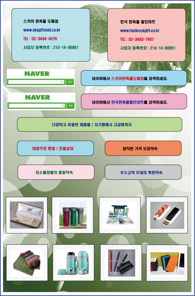 ① 판촉물, 기념품 전문 [한국 판촉물 할인마트]와 [스카이 판촉물 도매점]입니다.