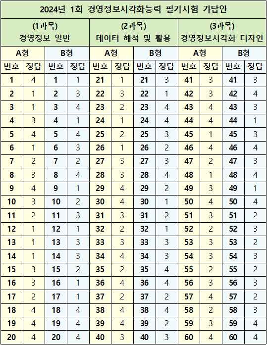 2024년 1회 경영정보시각화능력 필기시험 가답안 출처는 자격검정 시행기관인 대한상공회의소 운영 자격평가사업단 웹사이트입니다.