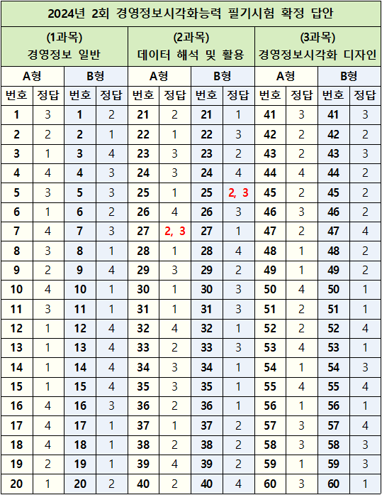 2024년 2회 경영정보시각화능력 필기시험 확정답안은 자격검정 시행기관인 대한상공회의소 자격평가사업단에서 시험 당일(11월 30일) 발표한 가답안에 대해 의견을 수렴한 후 결정한 최종 답안으로 출처는 자격평가사업단 웹사이트입니다.