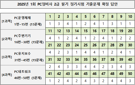 2025년 1회 PC정비사 2급 필기시험은 2월 23일에 시행되었고, 확정답안은 자격검정 시행기관인 한국정보통신자격협회에서 기출문제와 함께 공개한 가채점 답안에 대해 의견을 수렴한 후 결졍한 최종 정답으로 출처는 한국정보통신자격협회(icqa.or.kr) 웹사이트입니다.