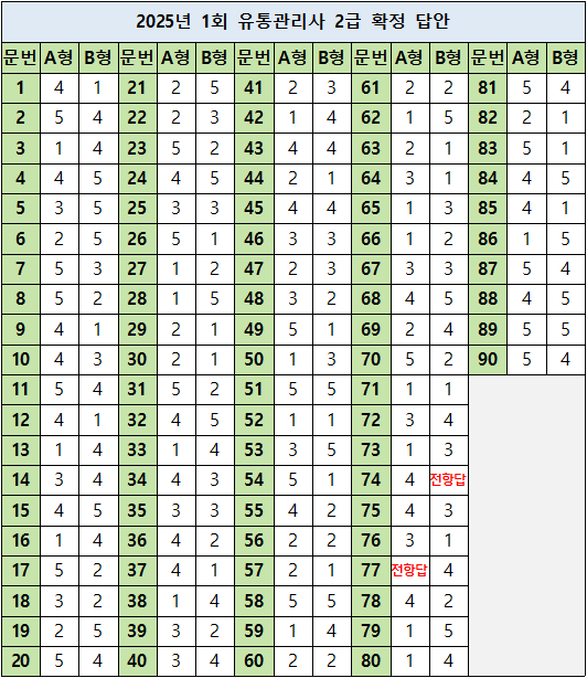 2025년 1회 유통관리사 2급 시험 확정답안은 자격검정 시행기관인 대한상공회의소에서 운영하는 자격평가사업단 웹사이트에 시험 당일(5월 3일 시행) 발표한 가답안에 대해 의견을 수렴한 후 결정한 최종 답안입니다.