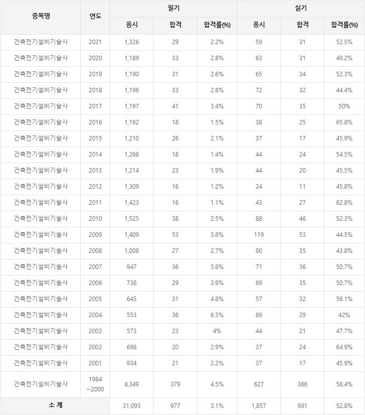건축전기설비기술사 응시인원, 합격인원, 합격률 (2021년까지) 작성자건시스템|작성시간22.07.07|조회수49 목록 댓글 0 글자크기 작게가 글자크기 크게가 2021년까지 시행한 건축전기설비기술사 연도별 자격검정 현황(응시인원, 합격인원, 합격률) 자료 출처는 한국산업인력공단에서 운영하는 웹사이트 큐넷(q-net.or.kr)입니다. 다음검색 현재 게시글 추가 기능 열기 북마크 공유하기 신고 센터로 신고 댓글 댓글 0 댓글쓰기 답글쓰기 댓글 리스트