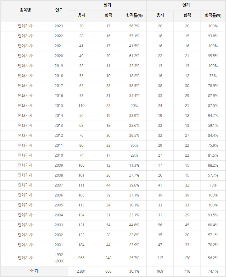 인쇄기사 연도별 자격검정 현황 (2023년까지) 작성자건시스템|작성시간24.03.28|조회수4 목록 댓글 0 글자크기 작게가 글자크기 크게가 2023년까지 시행한 인쇄기사 연도별 자격검정 현황(응시인원, 합격인원, 합격률) 자료 출처는 한국산업인력공단에서 운영하는 웹사이트 큐넷(q-net.or.kr)입니다. 다음검색 현재 게시글 추가 기능 열기 북마크 공유하기 신고 센터로 신고 댓글 댓글 0 댓글쓰기 답글쓰기 댓글 리스트
