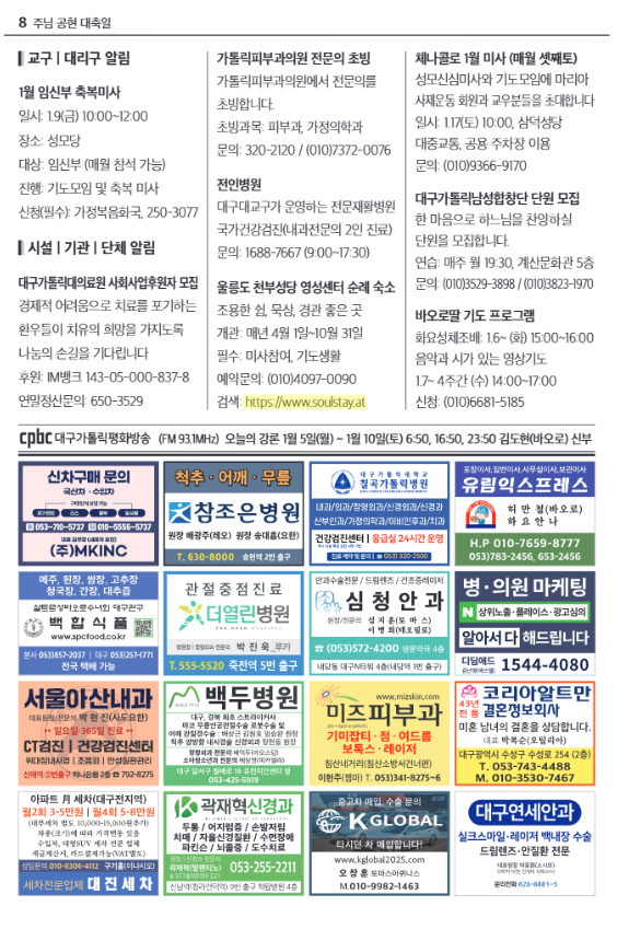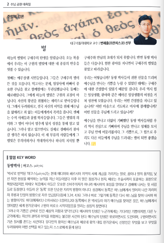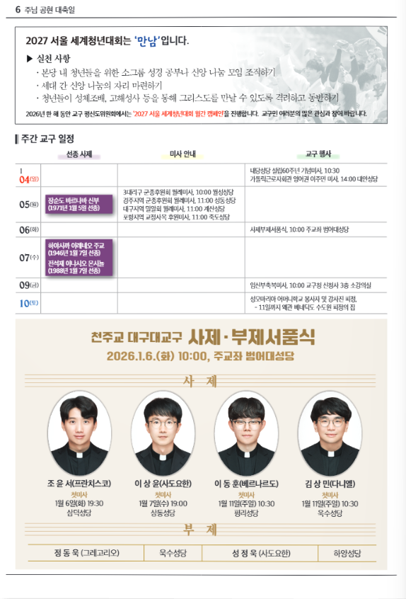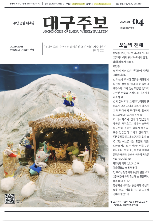 주님 공현 대축일(대구주보) 작성자정승은 글라라|작성시간26.01.02|조회수19 목록 댓글 0 글자크기 작게가 글자크기 크게가 다음검색 현재 게시글 추가 기능 열기 북마크 공유하기 신고 센터로 신고 댓글 댓글 0 댓글쓰기 답글쓰기 댓글 리스트