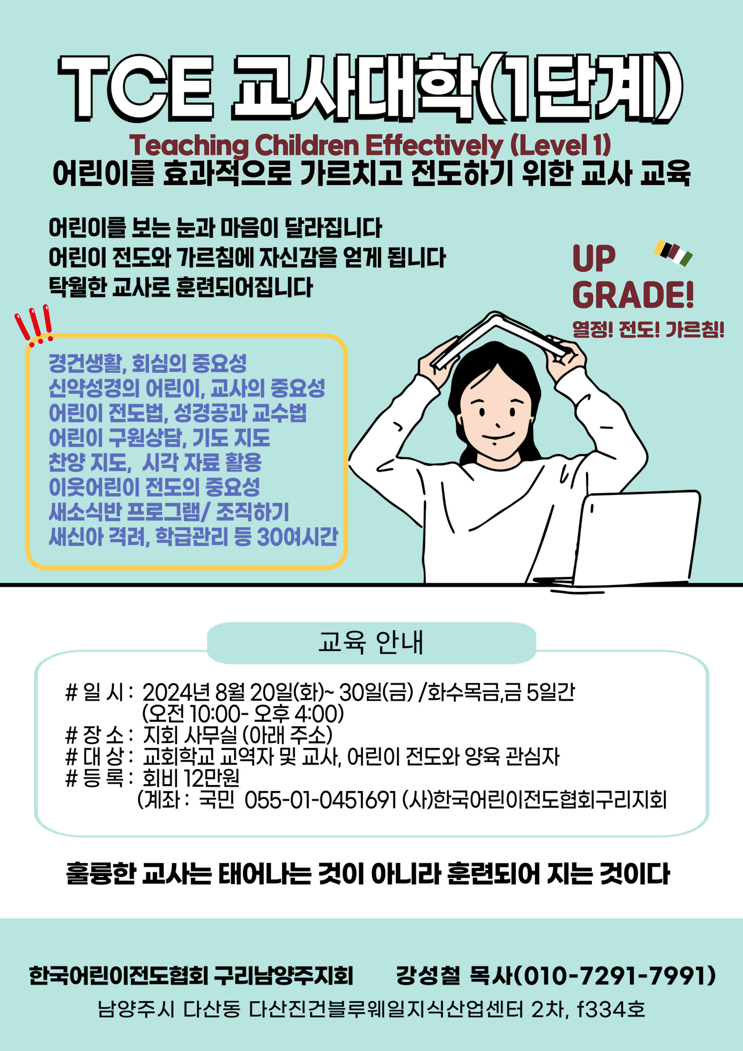 ㄴ샬롬! 2024년 여름 TCE 교사대학 1단계 일정을 올립니다.