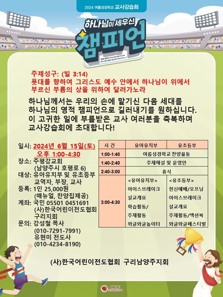 2024 여름성경학교 안내문 작성자구리지회|작성시간24.05.07|조회수163 목록 댓글 0 글자크기 작게가 글자크기 크게가 2024년 여름성경학교 강습회를 준비하였습니다구리 남양주 지역의 교회들의 많은 관심과 참여를 바랍니다감사합니다! 다음검색 현재 게시글 추가 기능 열기 북마크 공유하기 신고 센터로 신고 댓글 댓글 0 댓글쓰기 답글쓰기 댓글 리스트