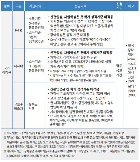 •장학금의 유형에는 한국장학재단이 지급하는 국가장학금, 우리 대학의 재정으로 지급하는 교내 장학금, 외부기탁자 등이 지급하는 교외 장학금이 있으며 장학금의 종류는 다양합니다. 선발기준과 신청방법, 신청기한은 매학기 계획에 따라 변경될 수 있으니 반드시 학교 홈페이지의 공지를 살펴보고 적극 신청하시길 바랍니다.