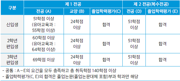 - 공통 : A~D의 요건을 모두 충족하고, 총 취득학점 140학점 이상