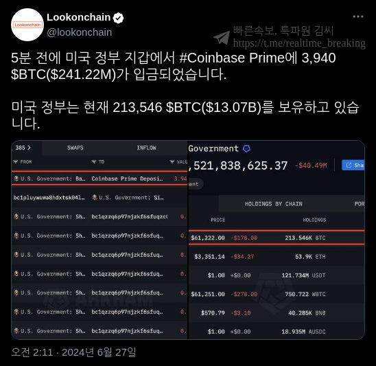 블록체인 분석업체 아캄인텔리전스에 따르면 미국 정부로 라벨링된 지갑 주소는 2억4122만 달러 상당의 비트코인 3940개를 코인베이스로 보냈다.