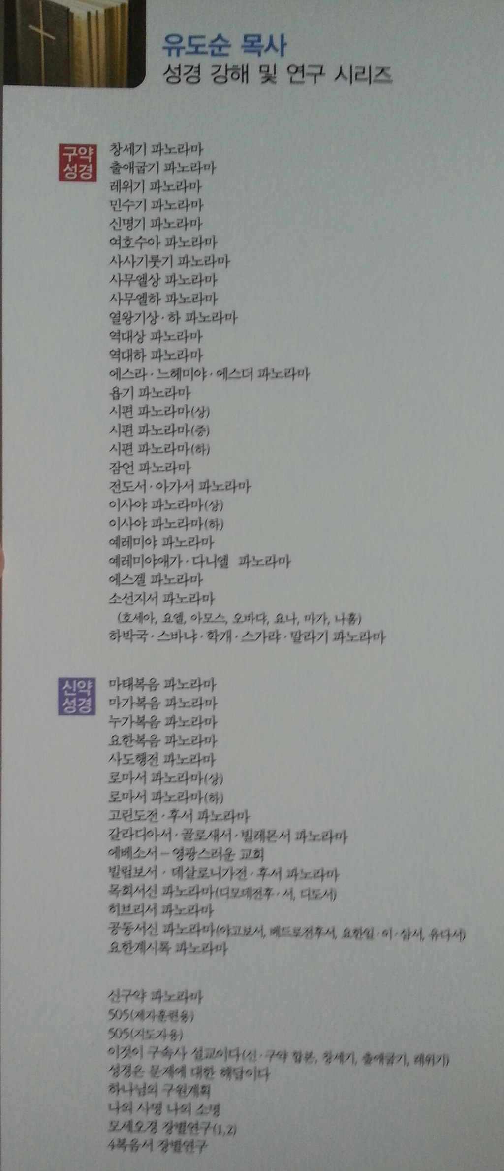 유도순 원로목사님 성경 강해 및 연구 시리즈 목록 작성자바람이어라|작성시간12.05.01|조회수763 목록 댓글 1 글자크기 작게가 글자크기 크게가 총판 기독교 출판유통 (031) 906-9191*카페에서는 책을 팔지않습니다 다음검색 현재 게시글 추가 기능 열기 북마크 공유하기 신고 센터로 신고 댓글 댓글 1 댓글쓰기 댓글 리스트 작성자해피바이러스 | 작성시간 12.09.08 파노라마 책을 전권 구입하고 싶은데요. 댓글 전체보기