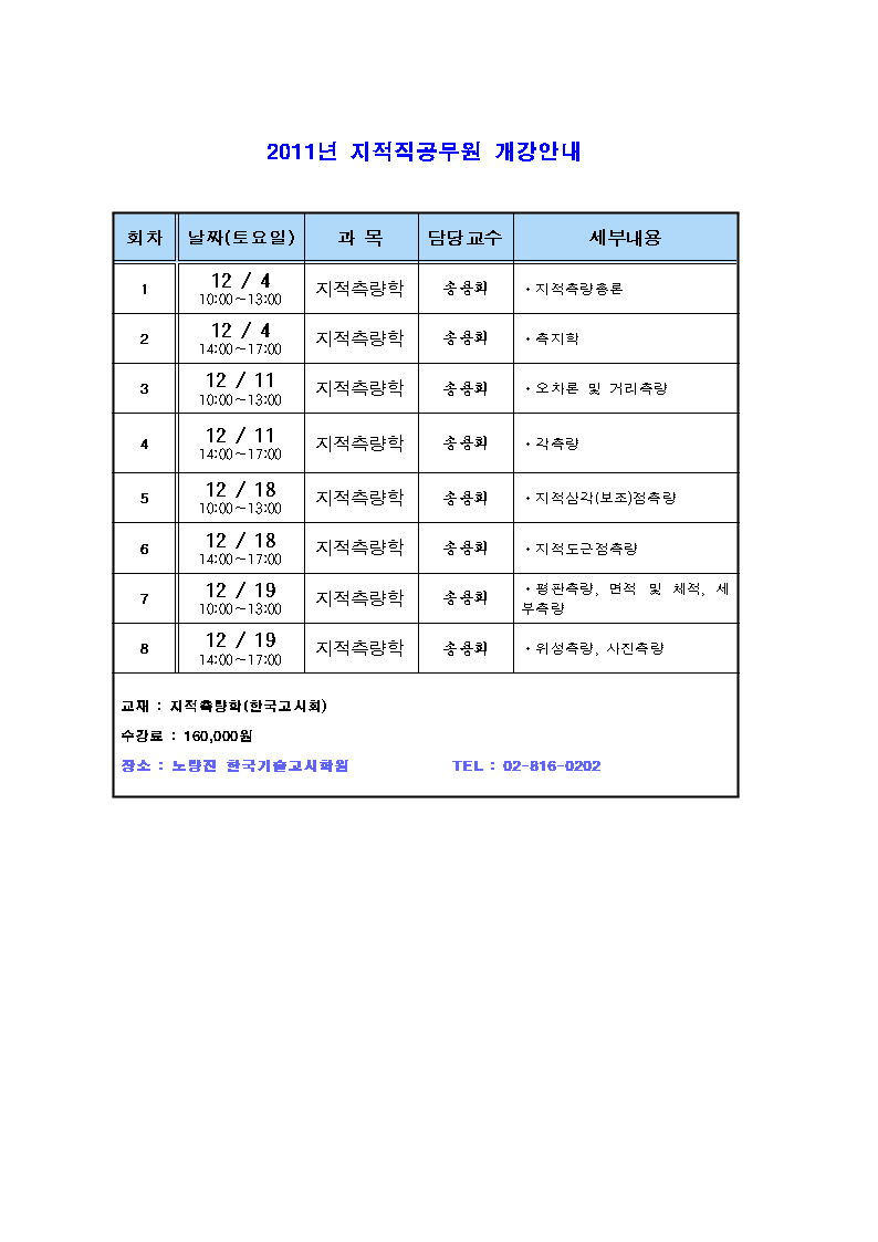 2011년 지적직 개강안내 작성자지적|작성시간10.11.21|조회수1,091 목록 댓글 0 글자크기 작게가 글자크기 크게가 2011년 지적직 시험대비 지적측량 강의를 1개월 과정으로 개강합니다. 다음검색 현재 게시글 추가 기능 열기 북마크 공유하기 신고 센터로 신고 댓글 댓글 0 댓글쓰기 답글쓰기 댓글 리스트
