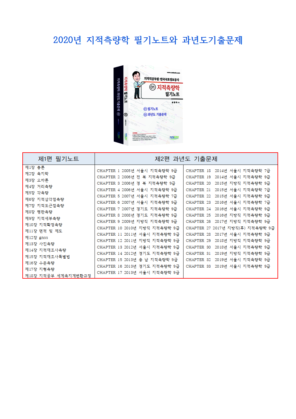 2020년 지적측량학 필기노트와 과년도기출문제 출간안내 작성자u_love♡|작성시간19.10.26|조회수146 목록 댓글 0 글자크기 작게가 글자크기 크게가 다음검색 현재 게시글 추가 기능 열기 북마크 공유하기 신고 센터로 신고 댓글 댓글 0 댓글쓰기 답글쓰기 댓글 리스트