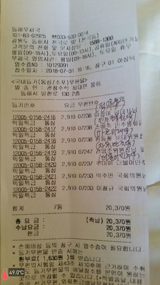 (7월 31일 등기로 보냈으므로 8월 1일 오전에 귀 국회 의원실에 도착 예정)