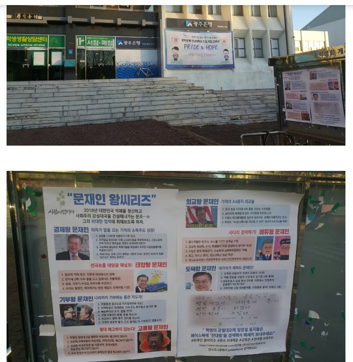 최근 전남대학교에 게재된 문재인 왕시리즈 대자보 위 사진에 우측 아래에 얘들아 미안하고 고맙다 세월호 학살 양심선언글 게재되어 있다. 목 차 1. 마차가 말을끄는 기적의 소득주도성장 2. 전국토의 태양광 패널화 3. 나라까지 기부하는 통 큰 지도자 4. 절대 해고하지 않는다 고용왕 문재인 5. 기적의 A4 용지 외교술 6. 사다리 걷어차기 교육왕 문재인 7. 드루킹 댓글 아들 취업비리 세월호 침몰 당일 회식 식사하고도 시치미 8. "얘들아 미안하고 고맙다" 사진