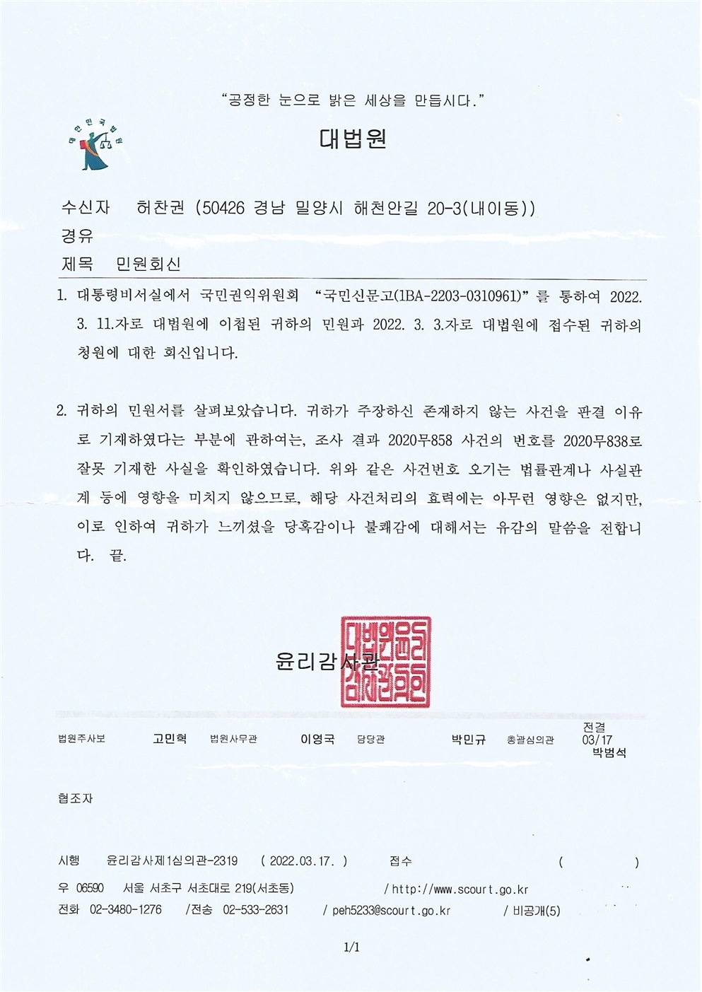 1. 2022. 3. 23. 송달받은 대법원 윤리감사관의 민원 회신(첨부 1)과 관련됨