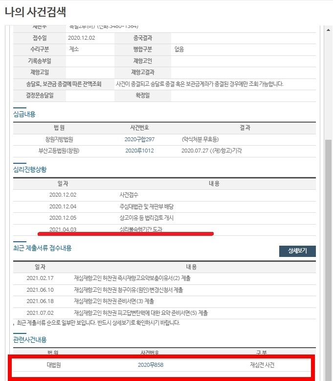 2. 대법원 나의 사건 검색란의 2021재무1388호의 2021. 04. 03. 심리불속행기간 도과 표시 및 재심 전 사건 2020무858호 표시 복사본 1부.