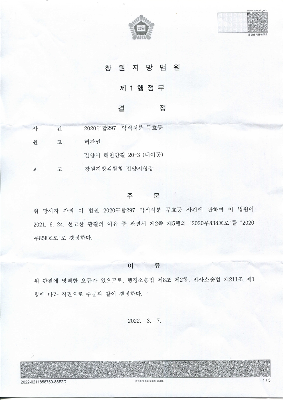 3. 창원지방법원 2020구합297호 판결 경정서 사본 1부