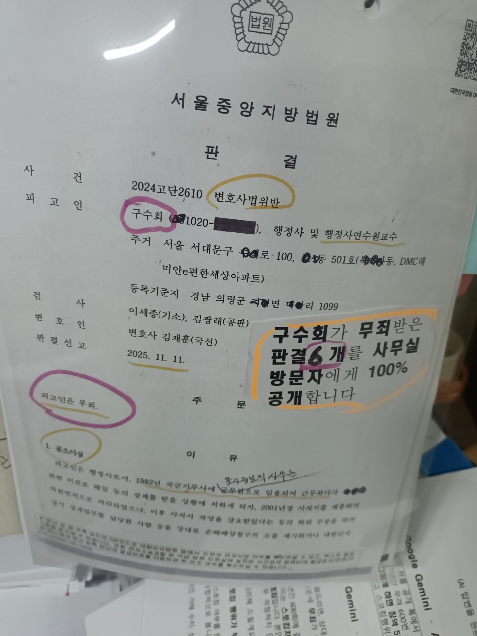 무죄 판결 5건 받음(신영애 건 2개 포함7개)