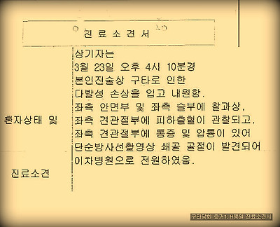 첫 번째 증거, 사건 당일 H병원 진료 소견서가 있다.