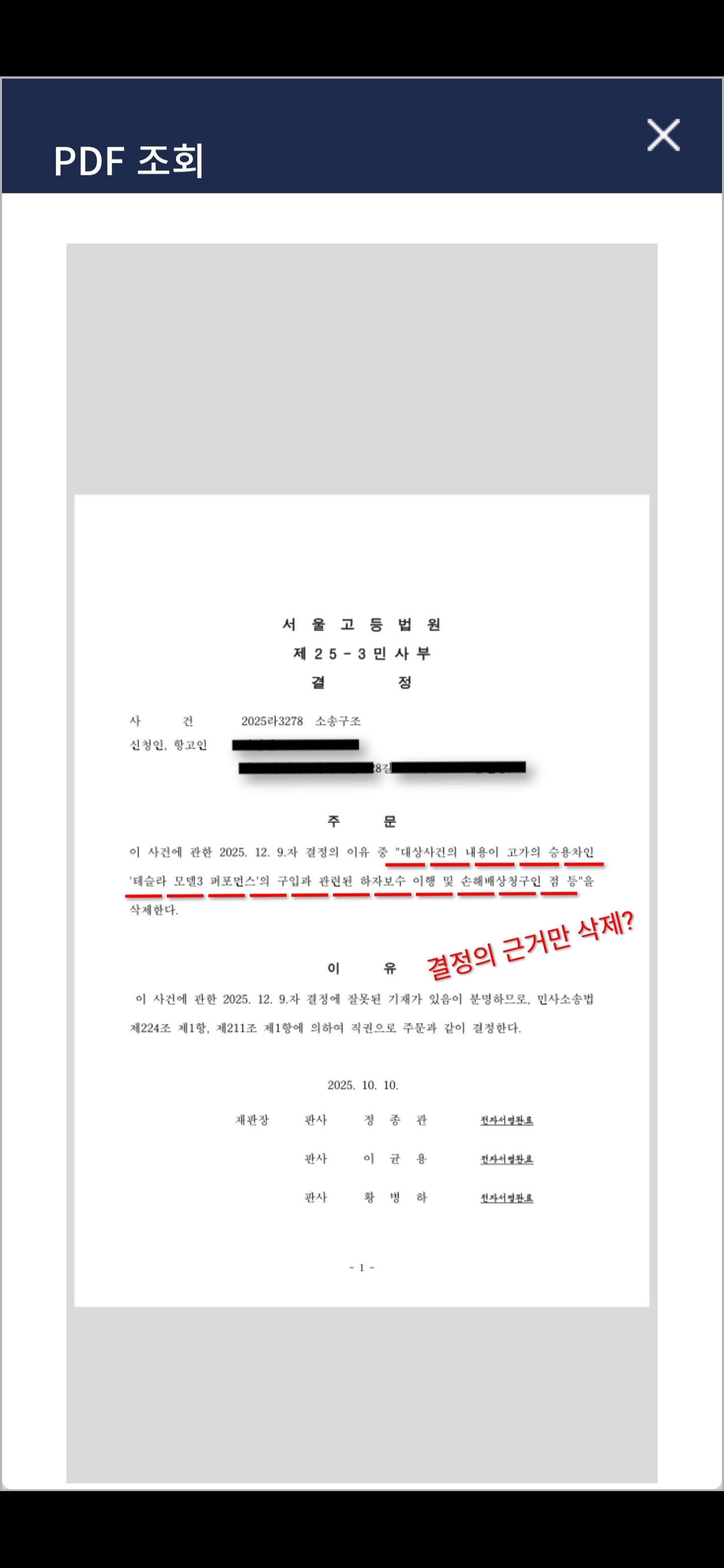 본인은 서울동부지방법원에서 소송구조를 신청하였으나 기각되었고, 이에 항고하여 사건이 서울 고등법원으로 이송되었습니다. 그러나 고등법원은 본인의 사건과 전혀 무관한 서울중앙지방법원 계류 사건(테슬라 사건)의 내용을 결정문에 기재하여, 본인의 소송구조 신청을 기각하였습니다. 이에 재항고인이 항의하자 법원은 이를 단순 경정으로 처리하겠다며 기각 결정의 근거로 판시한 문장 대부분을 취소한다는 경정결정으로 판결의 심리사항은 삭제하고 기각결정만을 유지하였습니다. 그러나 결정문에 심리사항을 삭제한다는것은 단순 글자표기 오탈자 수준을 넘어서는 중대한 오류입니다.