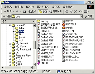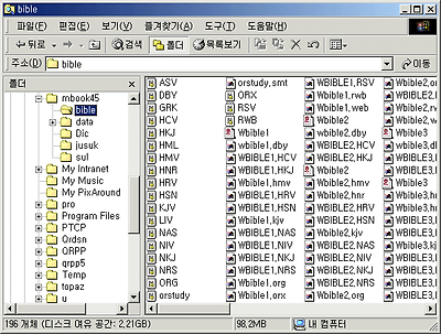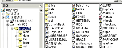 첫째로, 내사랑하는책 디렉토리 속의 하위 디렉토리 가운데 bible 디렉토리(아래 그림 참고)에는 성경데이타 파일들을 넣어주고 사용하시면 됩니다.