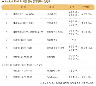 이번에 열린 ‘Transformation 2007’대회는, 먼저 1월 4일부터 6일까지 에스더 기도운동본부 주관으로 오산리최자실금식기도원에서 있었던 “7,000명 에스더 단식 구국성회”에 이어 진행된 것으로, 13일 오후 1시부터 14일 새벽 1시까지 열리는 “The Call” 12시간 금식기도회를 끝으로 마무리된다. 곧이어, 14일 오후 5시부터 15일 오후 10시까지 같은 장소에서 교단과 교파를 초월한 교회와 성도들이 이 민족을 복음으로 새롭게 하실 것을 간구하며 “역사를 이루는 기도-Revival 2007 28시간 연속 금식기도회”로 모일 예정이다.