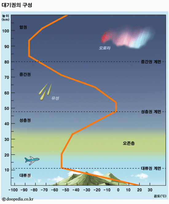12km에서 50km까지의 공간을 성층권이라 하는데 오존층이 있어 자외선을 흡수하는 곳이다