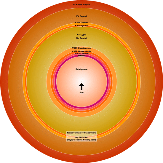 가장 큰 별로 알려진 VY Canis Majoris는 지름이 1,976,640,000km다