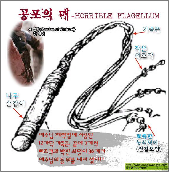 로마의 군병들이 예수님을 내리쳤던 채찍은 나무 손잡이에 12가닥의 가죽 끈으로 되어있었고, 각 가죽 끈의 끝마다 3조각의 뼈조각과 전갈모양의 뾰족한 쇠덩어리 36개가 매달려 있었기에 채찍질을 당하실 때마다 살점이 뚝뚝 떨어져나가고 피가 솟구치는 고통을 당하셔야 했습니다. 그 잔혹한 채찍에 맞아 등은 밭이랑처럼 갈라지고 온 몸이 갈갈이 찢겨지신 상태로 또 채찍에 맞으시며 육중한 십자가를 지시고 작열하는 뜨거운 태양의 기운아래 턱 밑까지 턱턱 차오르는 거친 숨을 헉헉 몰아쉬시며 갈보리 언덕길로 올라가야만 하셨던 예수님의 그 처절한 아픔과 고통을 알아야 합니다. 십자가의 사형틀에 매달리기 위해 손과 발을 관통하는 대못이 박히고 머리에 가시 면류관이 쓰여지고 꾹 눌려져 물과 피를 다 쏟으셔야 했습니다. 옆구리로부터 심장까지 창으로 찔려 구멍이 나고 물과 피를 단 한 방울도 남김없이 다 쏟으셔야 했습니다.