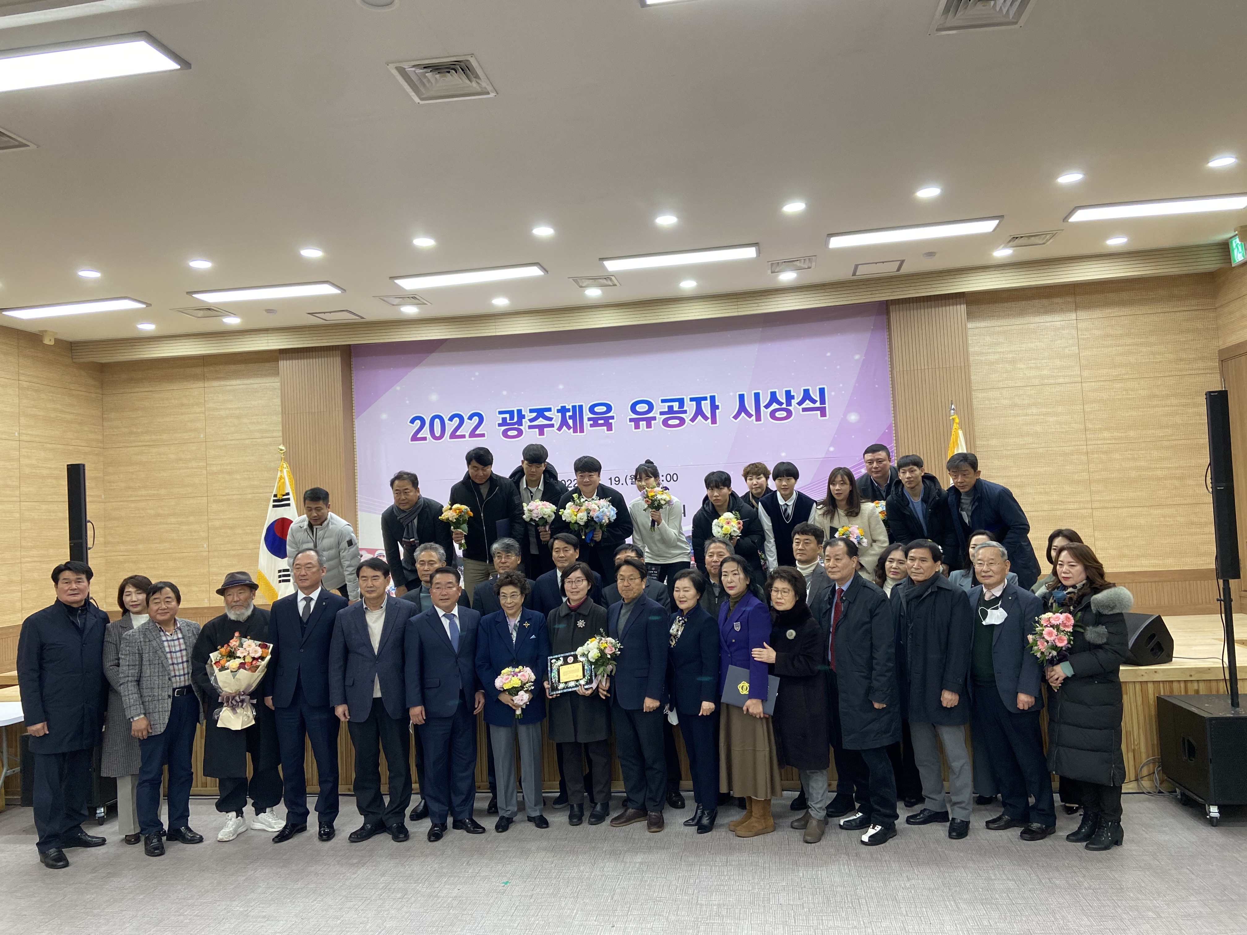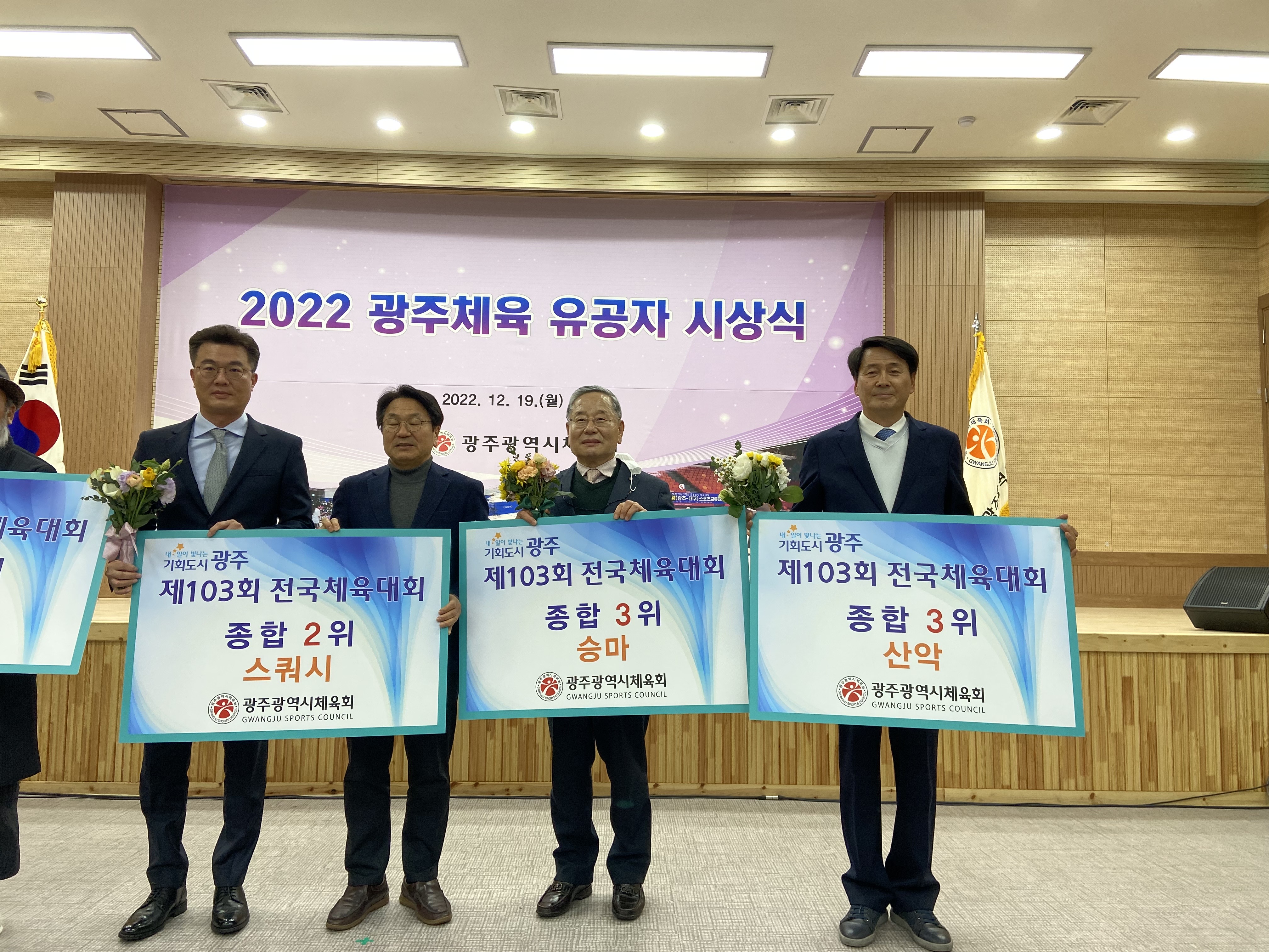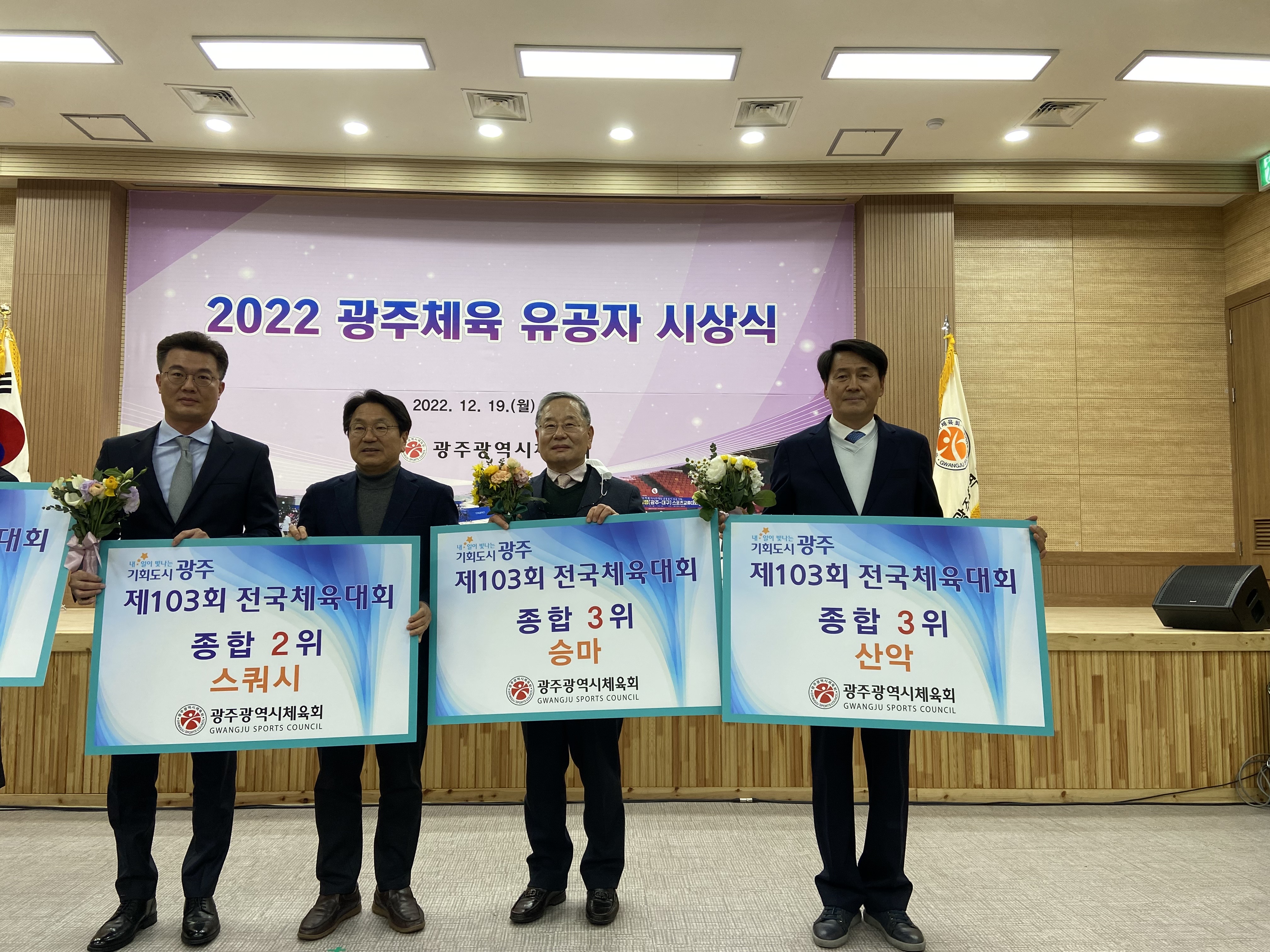 19일 국민생활관 세미나실에서 강기정 광주광역시장, 정무창 광주광역시의회 의장, 이정선 광주광역시교육감, 김광아 광주시체육회 회장직무대행 등 기관장들과 선수, 지도자, 동호인, 육성팀 단체장 등 2022년 한 해를 빛낸 광주체육인 200여 명이 참석한 가운데 ‘2022 광주체육 유공자 시상식’을 개최했다. 2022 광주체육 유공 수상자' 현황으로는 1부 전국체전 해단식에서 광주가 종합 12위를 달성하는 데 공을 세운 입상종목단체, 감독, 코치, 선수에게 포상했다. 양궁, 궁도가 종합 1위, 스쿼시 종합 2위, 승마와 산악이 종합 3위를 차지했다.