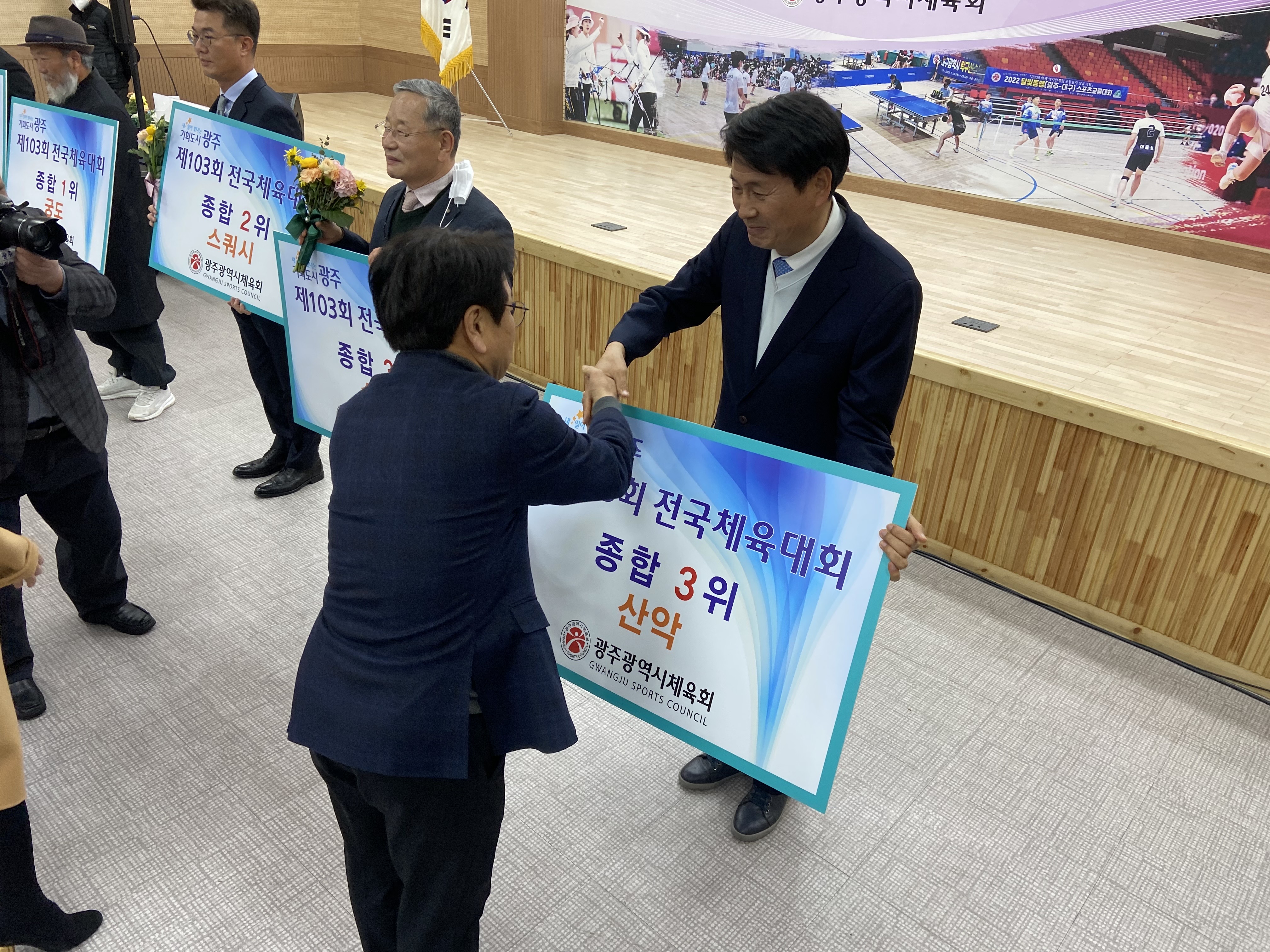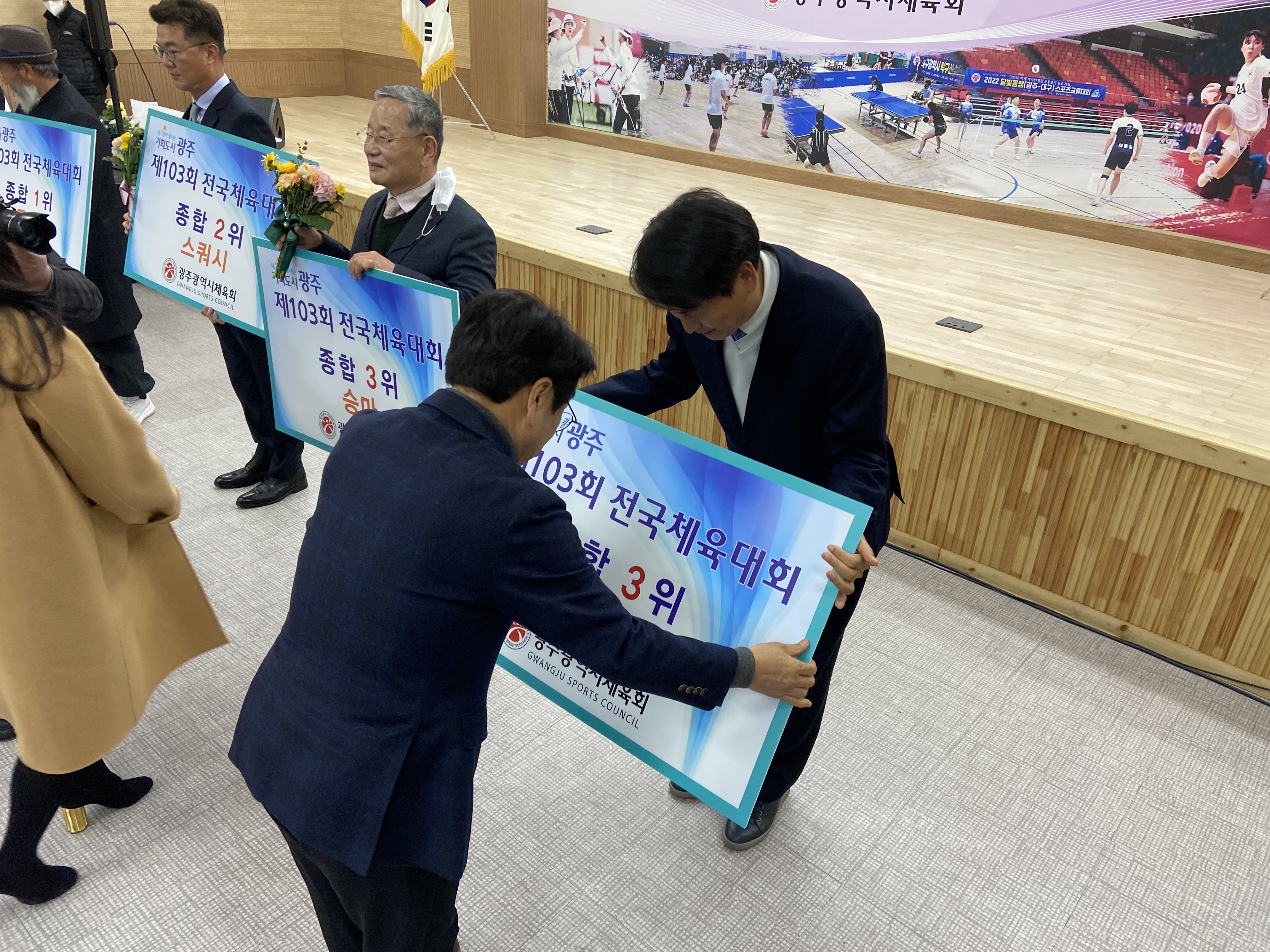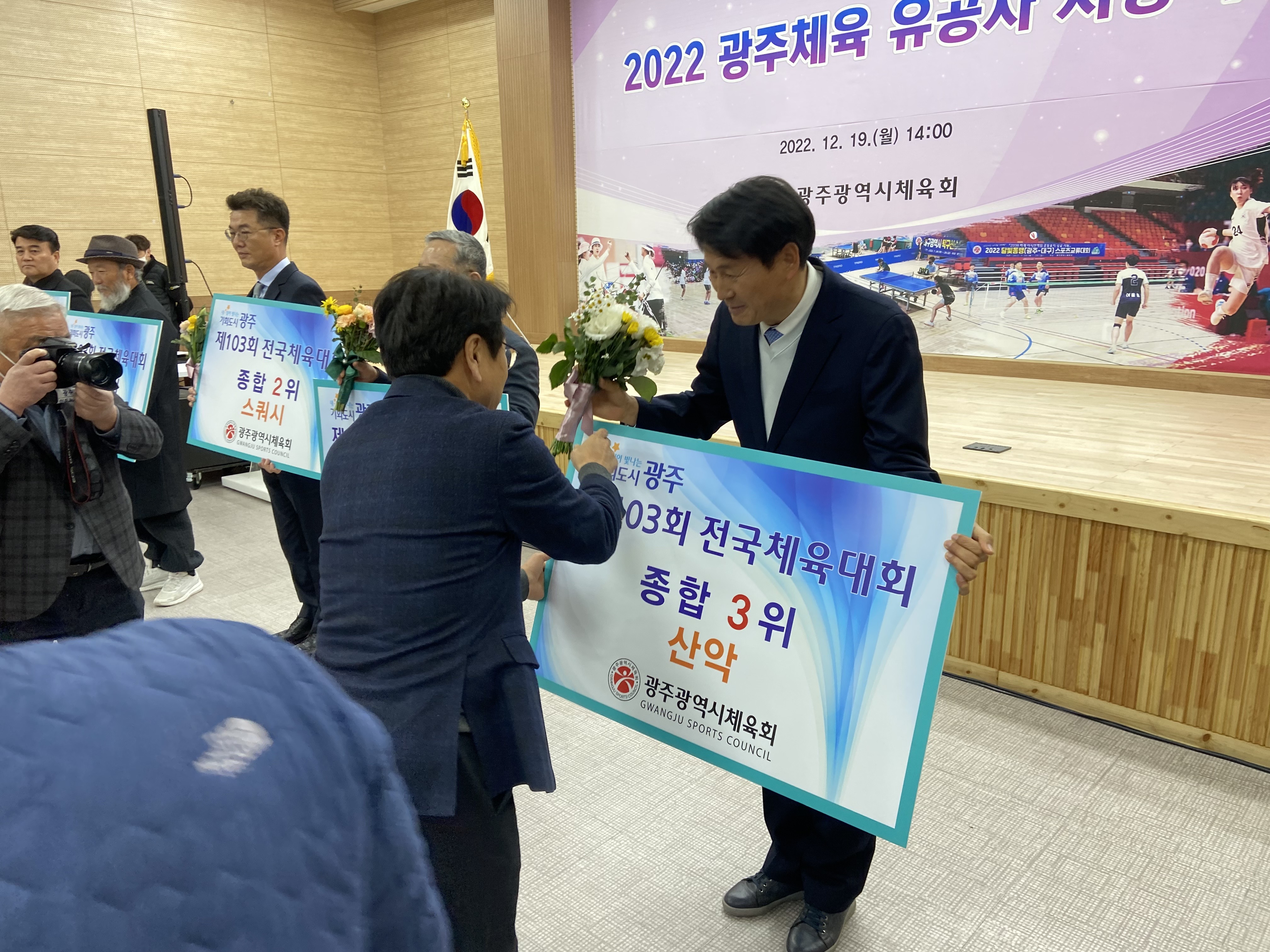 19일 국민생활관 세미나실에서 강기정 광주광역시장, 정무창 광주광역시의회 의장, 이정선 광주광역시교육감, 김광아 광주시체육회 회장직무대행 등 기관장들과 선수, 지도자, 동호인, 육성팀 단체장 등 2022년 한 해를 빛낸 광주체육인 200여 명이 참석한 가운데 ‘2022 광주체육 유공자 시상식’을 개최했다. 2022 광주체육 유공 수상자' 현황으로는 1부 전국체전 해단식에서 광주가 종합 12위를 달성하는 데 공을 세운 입상종목단체, 감독, 코치, 선수에게 포상했다. 양궁, 궁도가 종합 1위, 스쿼시 종합 2위, 승마와 산악이 종합 3위를 차지했다.