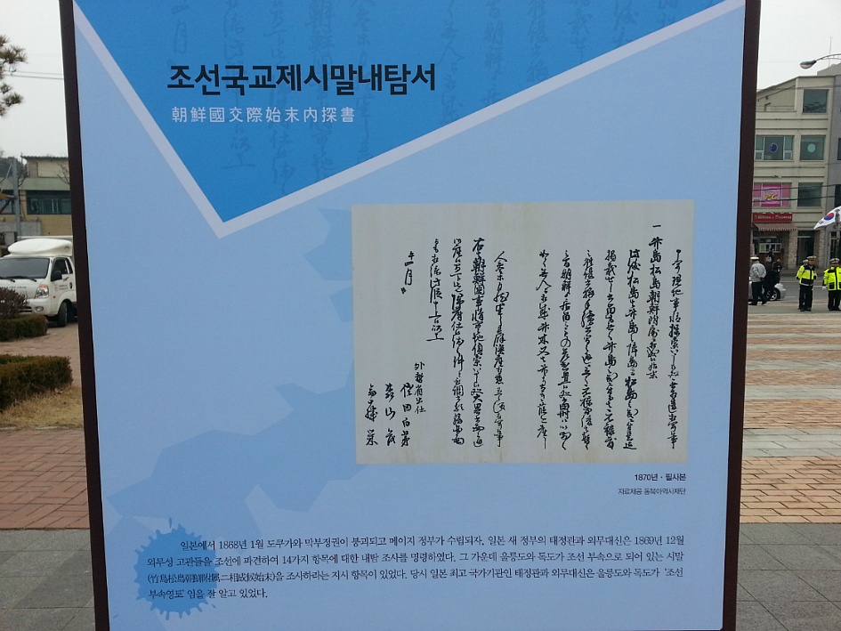 그 가운데 울릉도와 독도가 조선 부속으로 되어 있는 시말(竹島松島朝鮮附屬二相成候始末)을 조사하라는 지시 항목이 있었다.