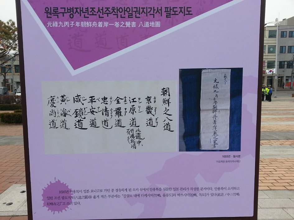 안용복이 소지하고 있던 조선 팔도지도(朝鮮 八道地圖)를 옮뎌 적은 부분에는