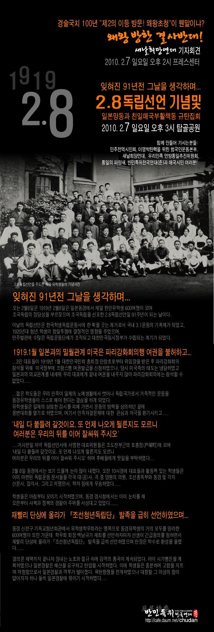 동양 최대의 강국임을 자랑하며 세계 5대 강국의 하나로 자처하던 일본의 수도, 그들이 신성 불가침이라고 자존자대(自尊自大)하는 소위 천황이 있는 동경에서 우리 강산을 짓밟고 유구 신성한 민족을 노예시하는 침략 일제에게 대항하였다는 것은 주목할 만한 일이다.