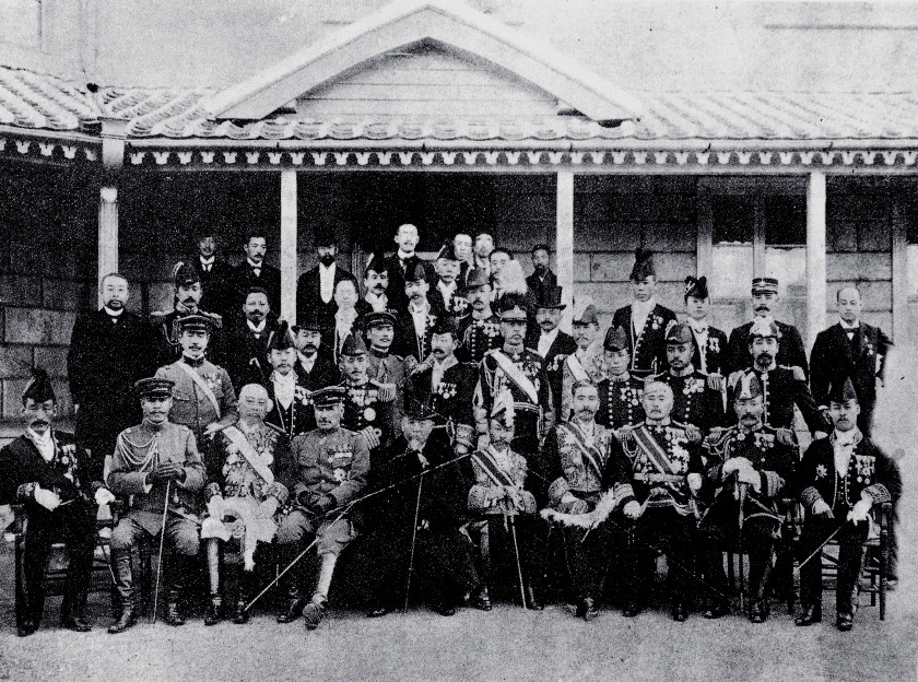 이토히로부미와 그의 측근들이 을사늑약 체결을 성공적으로 마치고 뒷풀이 기념사진을 찍고 있다.